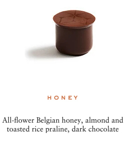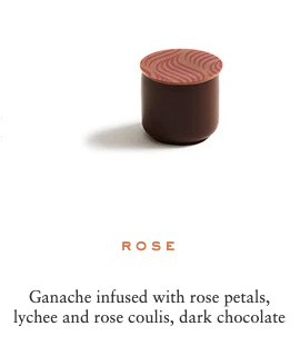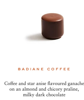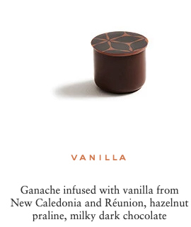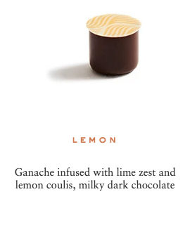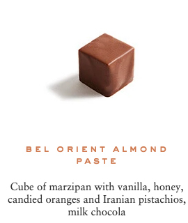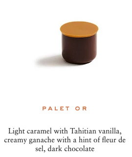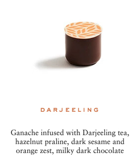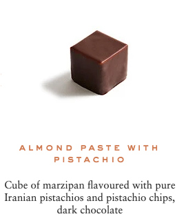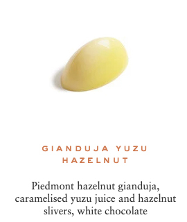 Sugar, cocoa beans, cocoa butter, cream milk powder, fresh cream, hazelnuts, marzipan (contains: almonds), almonds, butter, dextrose, feuilletine (contains: gluten, soya, milk), glucose, invert sugar, pistachios, honey, sweetener: sorbitol, cashew nuts, lime pulp, lactose, sweetener: glycerine, yuzu juice, raspberry pulp, passion fruit pulp, water, blackcurrant pulp, emulsifier: sunflower Lecithin, bergamot pulp, ginger, fondant sugar, confit orange, natural vanilla, salt, toasted rice, coffee, sesame, matcha tea, lemon pulp, chicory, Kalamansi vinegar, Earl Grey tea, lime zest, orange blossom flavouring, cinnamon, orange flavouring, Darjeeling tea, Timut pepper, rose petals, Kaffir lime zest, orange zest, ylang ylang flavouring, grapeseed oil, natural ginger flavouring, natural rose flavouring, natural lime flavouring, star anise, radish concentrate, blackcurrant concentrate, apple concentrate, lemon concentrate, safflower concentrate, spirulina.